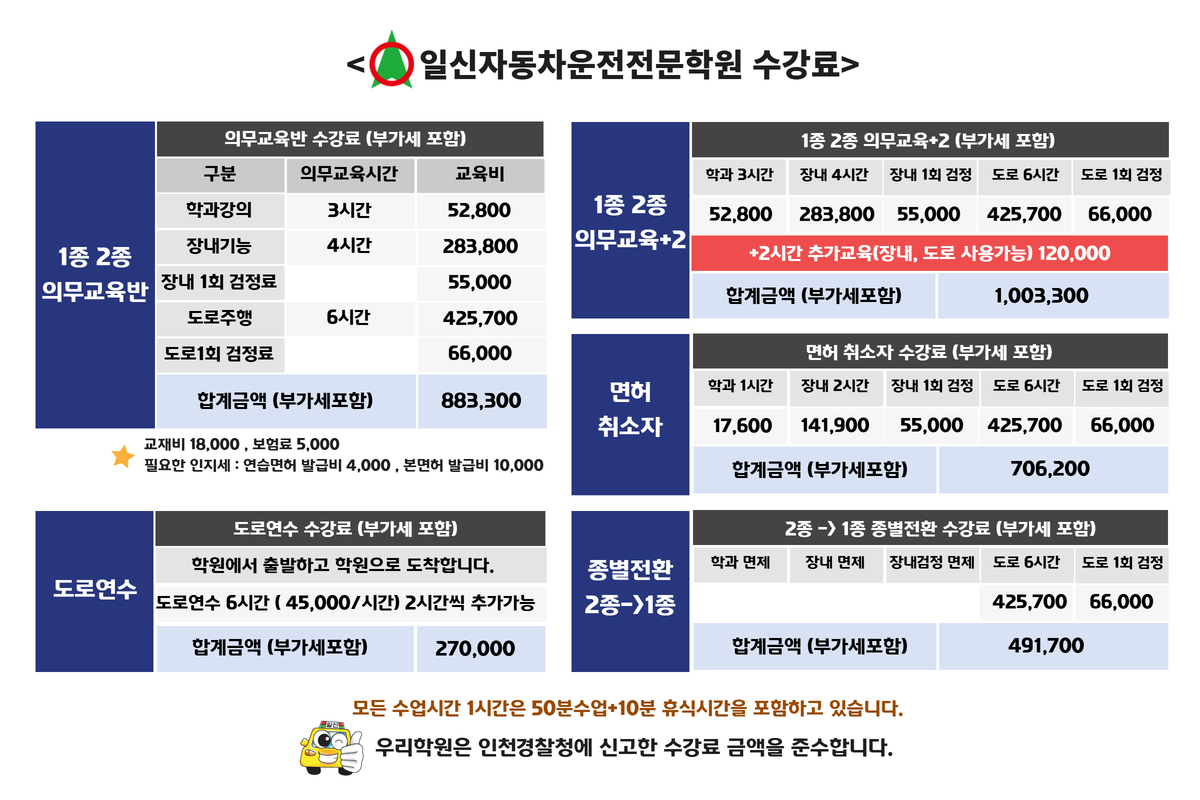 - 환불, 취소 등 납입된 수강료 등은 공정거래위원회의 자동차운전학원표준약관 및 도로교통법 시행령에 의거하여 처리됩니다.